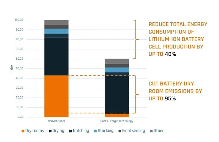 Battery dry rooms are, therefore, the main contributor to the high CO2 footprint in battery cell manufacturing when they use conventional dehumidification systems that require large quantities of gas and/or electricity to run the dehumidifiers to keep the dry room dry. The consumption from these conventional gas and electric-only dehumidifiers contributes up to 8,1% of the total CO2 footprint of the battery.