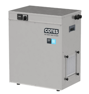 Cotes’ Portuguese partner, ClimaConforto and its installer, Instavac, installed Cotes Hybrid CH26 dehumidifiers — compact, stainless-steel units designed for low-noise operation and flexible placement. The CH26 is used because it eliminates the need to drill wall penetrations for fresh-air intake or exhaust. Unlike traditional desiccant units, the CH26 employs a fully closed regeneration-air loop. The process air is simply drawn from the room, passed through the unit, and returned to the space—only drier.